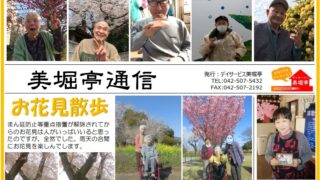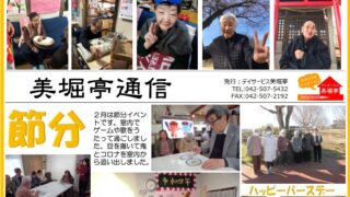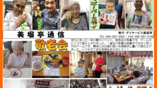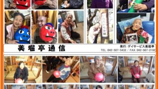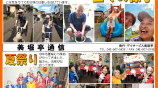 「美堀亭通信」では、こうした日頃の様子を皆さまにお届けしていました。デイサービス美堀亭の閉鎖に伴い、「過去の写真が見たい」といった多くのご要望をいただいたため、このページで過去の広報紙を掲載していく予定です。